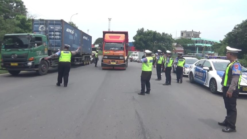 Surabaya, metrotvjatim.com – Patroli Jalan Raya (PJR) Direktorat Lalu Lintas (Ditlantas) Polda Jatim, melaksanakan pembatasan angkutan barang kendaraan sumbu tiga di ruas jalan tol Perak, Surabaya, Jawa Timur pada Sabtu (20/12/2025).
