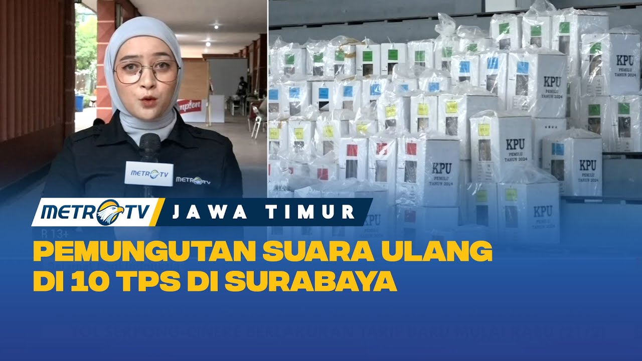METRO TV JATIM, KPU Surabaya merespons surat rekomendasi bawaslu terkait pemungutan suara ulang di 10 tps di Surabaya. Keputusan ini diambil setelah 8 tps didapati terdapat kesalahan distribusi logistik pemilu, dan 2 tps bermasalah dengan pemilih tidak terdaftar.
