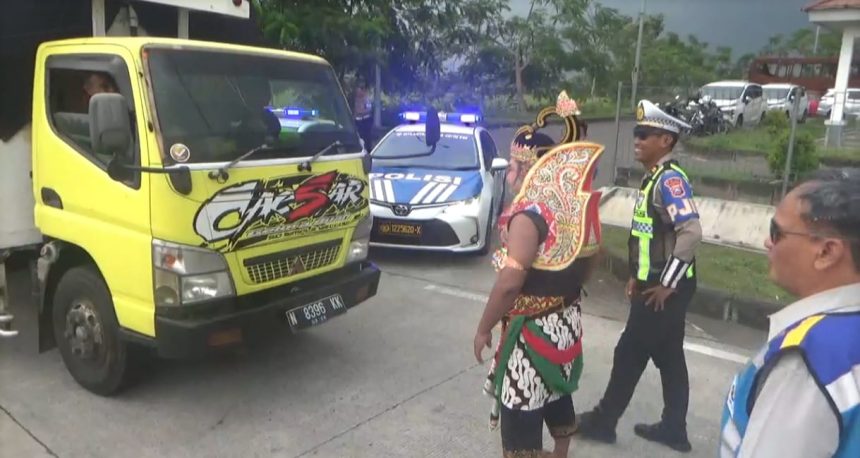 Nganjuk, metrotvjatim.com : Sosok Gatotkaca muncul di ruas Tol Nganjuk–Ngawi. Bukan untuk pentas wayang, melainkan menyosialisasikan larangan penggunaan lajur kanan bagi bus dan truk.