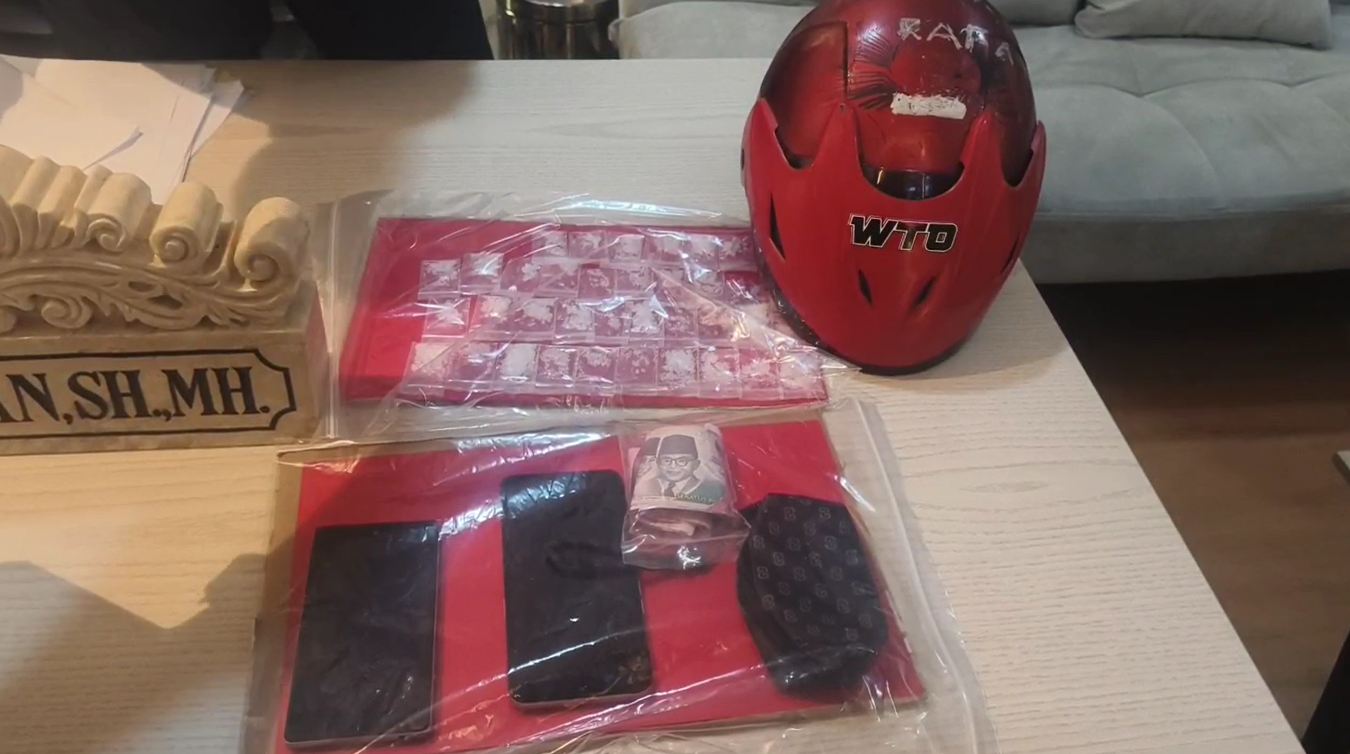 Petugas menyita satu helm berwarna merah yang digunakan untuk menyembunyikan sabu. Di dalam helm tersebut, polisi menemukan 37 paket plastik kecil berisi sabu dengan berat bruto 11,9 gram. Polisi juga mengamankan uang tunai sebesar Rp1,2 juta yang diduga hasil penjualan.