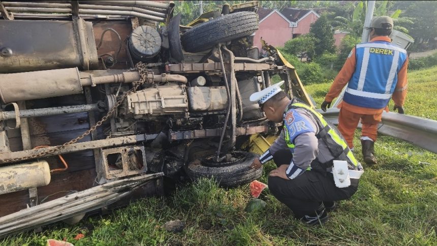 Truk baru berhenti setelah terguling di luar pembatas jalan. Seluruh muatan semangka, tumpah ke area bawah tol hingga sempat jadi rebutan warga.
